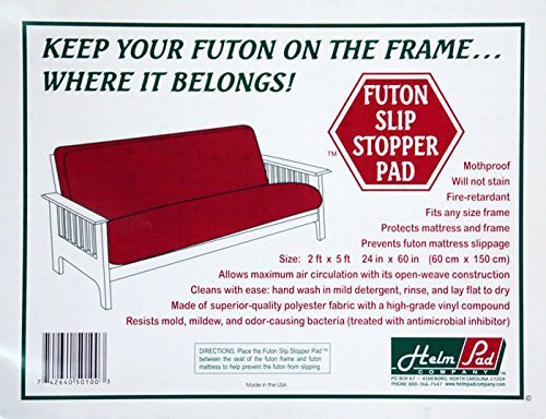 -. Binding : Kitchen -. Brand : Helm Co. -. Color : n/a -. EAN : 0742640501003 -. Feature : Prevents futon mattress slippage / Will not stain, resists mold and mildew / Fits any size frame, 24" x 60" (60cm x 150cm) / Durable and easy to use / Fire-retardant, moth-proof, protects mattress and frame -. IsAutographed : 0 -. Label : Helm Pad Company -. Manufacturer : Helm Pad Company -. Model : SS24P -. MPN : SS24P -. PackageQuantity : 1 -. PartNumber : SS24P -. ProductGroup : Home -. ProductTypeName : HOME -. Publisher : Helm Pad Company -. Studio : Helm Pad Company -. Title : Non-slip Futon Grip Pad (Slip Stopper Pad) by Helm Pad -. UPC : 742640501003