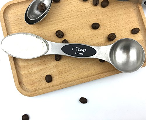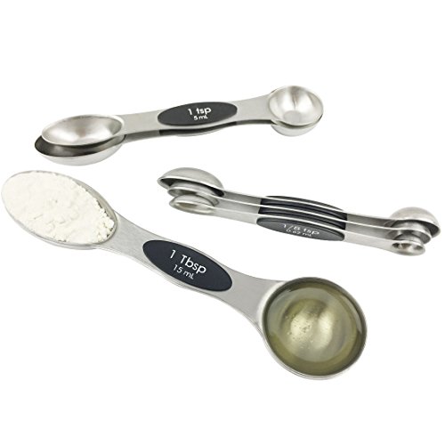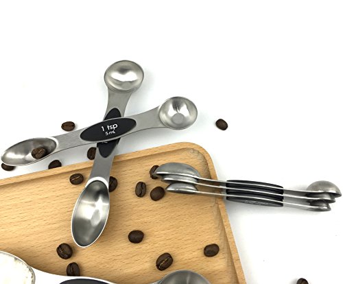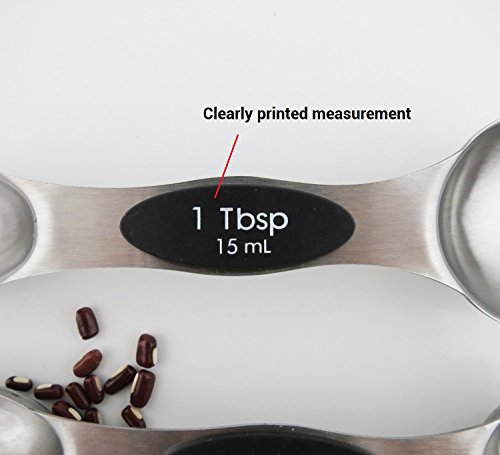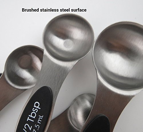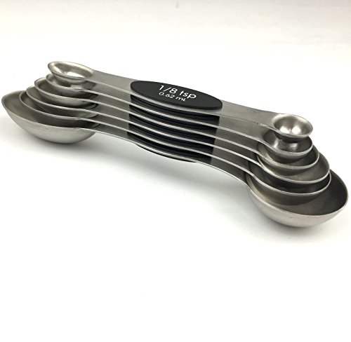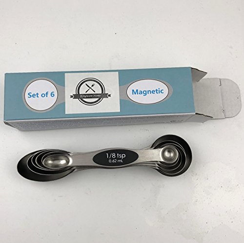 Studio : Kingware Home Publisher : Kingware Home Product Description These magnetic 18/10 stainless steel measuring spoons are both functional and efficient in design 1. The narrow end is designed to fit most spice jars and the round end is perfect for liquids 2. A flat base allows the spoon to rest on the counter top without spilling the contents 3.Magnets in the spoons keep them nested together while storing 5. Set includes 1/8 tsp,1/4 tsp, 1/2 tsp, 1 tsp, 1/2 Tbls, and 1 Tbls 6. Easy grip surface, dishwasher safe, keep no rust with 18/10 stainless steel material Stay together. An innovative magnetic stacking design keeps your five most-used measuring spoons within reach always right where you left them. Crafted from stainless steel with a non-slip handle, each spoon is easy to level for an always-accurate approach to creating making. Magnetic feature in handles lets you remove one spoon at a time also keeps them neatly stacked together Sturdy stainless steel designs make leveling ingredients easy for greater accuracy Each spoon handle has measurement marking non-slip handles Dishwasher safe Lifetime warranty 0