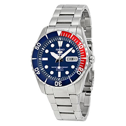 Stainless steel case with a stainless steel bracelet. Uni-directional rotating black and red ion-plated bezel. Black dial with luminous hands and index hour markers. Minute markers around the outer rim. Dial Type: Analog. Luminescent hands and markers. Day of the week and date display at the 3 position. Automatic movement. Scratch resistant Hardlex crystal. Pull / push crown. Skeleton case back. Case diameter: 44 mm. Case thickness: 13 mm. Round case shape. Band width: 23 mm. Fold over clasp with safety release. Water resistant at 100 meters / 330 feet. Functions: date, day, hour, minute, second. Dress watch style. Seiko 5 Blue Dial Stainless Steel Automatic Mens Watch SNZF15.중량: 1 pound 이쪽의 상품은 주문일로부터 배송까지 10일부터14일 정도 시간을 받고 있습니다.스탭 일동?고객에 안심하고 거래 주시는 바와 같이(하도록) 유의하고 있습니다?