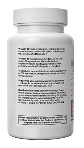 Exceptional quality is ensured with the best Vitamin B6 supplements available today. If improving cardiovascular and mental health is your goal, Superior Labs's Vitamin B6 is great for you. Superior Labs stands by our products and offers our loyal customers a 60-day 100% money-back guarantee on purchases of our natural Vitamin B6 supplement. This product is a dietary supplement.
