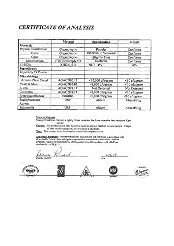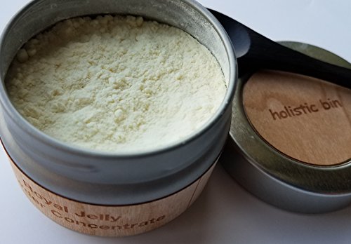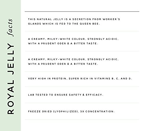 Royal Jelly contains proteins, carbohydrates, fats, free amino acids, vitamins and minerals. It contains about 70 percent water, 15 percent proteins, 3 percent to 6 percent fats, and 2 percent to 3 percent vitamins, salts and amino acids. - This Tibetan Royal Jelly is Lyophilized, highly concentrated, freeze-dried powder. - It is important never to heat royal jelly because it will destroy all of the enzymatic properties and some of the proteins that make it beneficial for human consumption. -Store in a cool, dry location; Refrigeration not required. Serving suggestion: 1/4 teaspoon, once a day or as desired. - Royal jelly contains a rich variety of nutrients including minerals like calcium, copper, iron, phosphorous, silicon, sulfur, and potassium, as well as a wealth of B-family vitamins, biotin, inositol, folate, nucleic acids, gamma globulin, and 17 different amino acids, including the 8 essential amino acids that the human body cannot produce, and must, therefore, get from their diet. - Powdered royal jelly is easy to mix into cold beverages or other foods.Feature