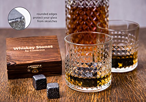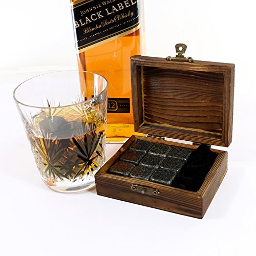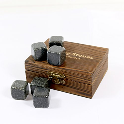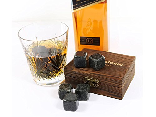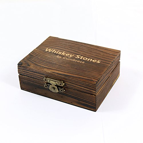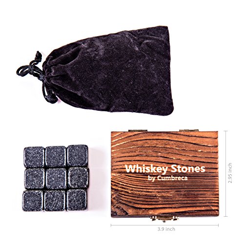 It’s said that real men drink whiskey. For a long time, whiskey drinkers have been diluting their drinks with ice. This is over. Whiskey stones, were originally created for whiskey drinkers, to use as a substitute for ice cubes. Although they do not get as cold as regular ice cubes, they have a more sustainable temperature and their purpose is to keep your whiskey cool without diluting it. You can find whiskey stones made of steel, soapstone or even of plastic, which do not always complement all beverages. But now, we provide a much higher quality which are available - Cumbreca Whiskey Stones, made of polished granite. Whiskey Stones for a lifetime Polished Granite FDA chilling rocks can survive the journey from freezer to glass and back for an unlimited number of reuses and will never fail. After only four hours in the freezer, these granite cubes will chill your beverage in five minutes or less. Add three to your drink and watch them work their cool magic! This material is perfect for chilling any beverage, from your favorite rye whiskey to a freshly-shaken winter cocktail. Make your friends happy! Do people around you like drinks icy chilled and with pure taste as well as you? Then they will definitely provide as a valuable gift! Whiskey Stones are a great gift for people who love perfect taste without compromises. Features specs: Suitable Dimensions: 0,8 x 0,8 x 0,8 inches Luxury Material: Black polished granite FDA The designed wooden box contains 9 stones and a velvet pouch for whiskey stone refrigerator storage