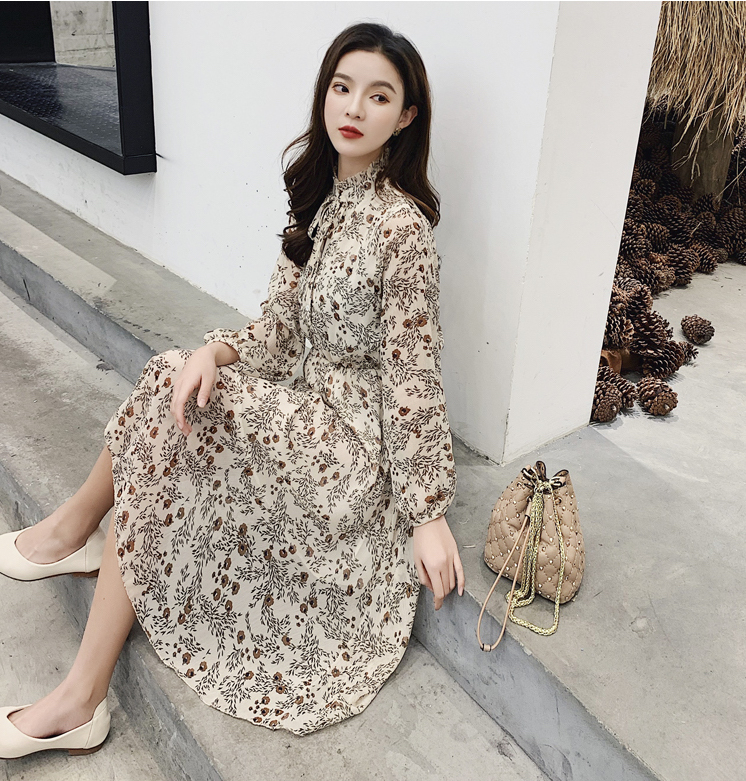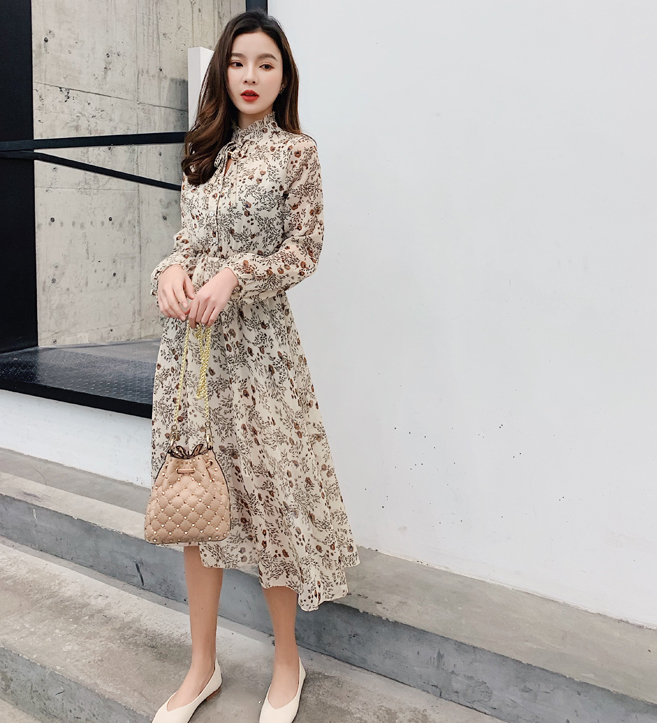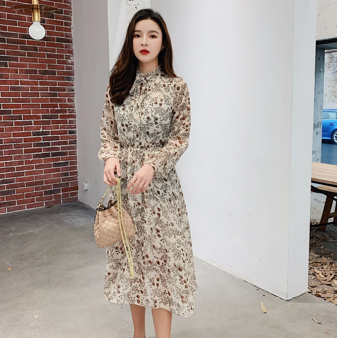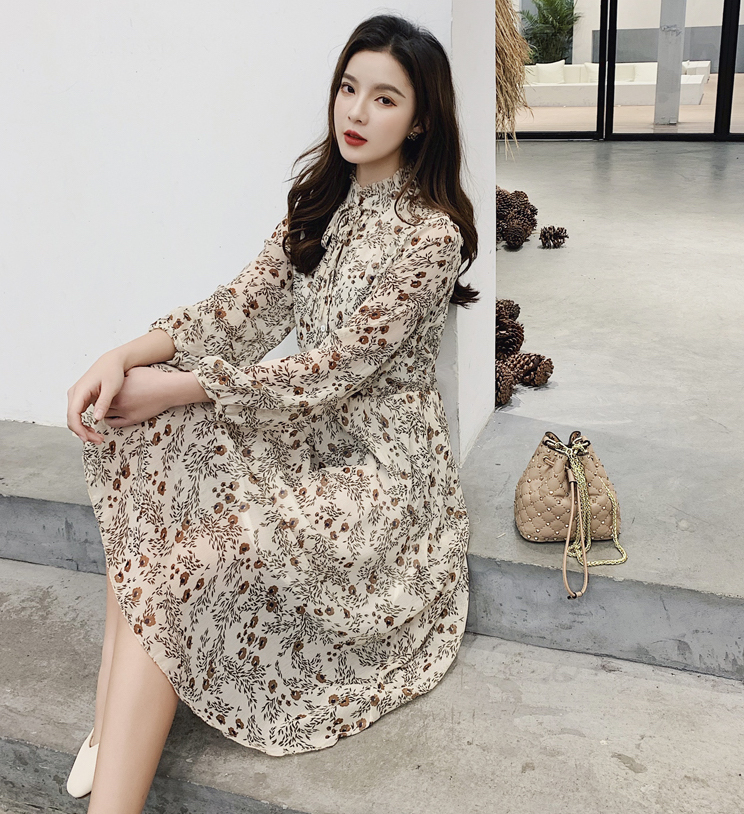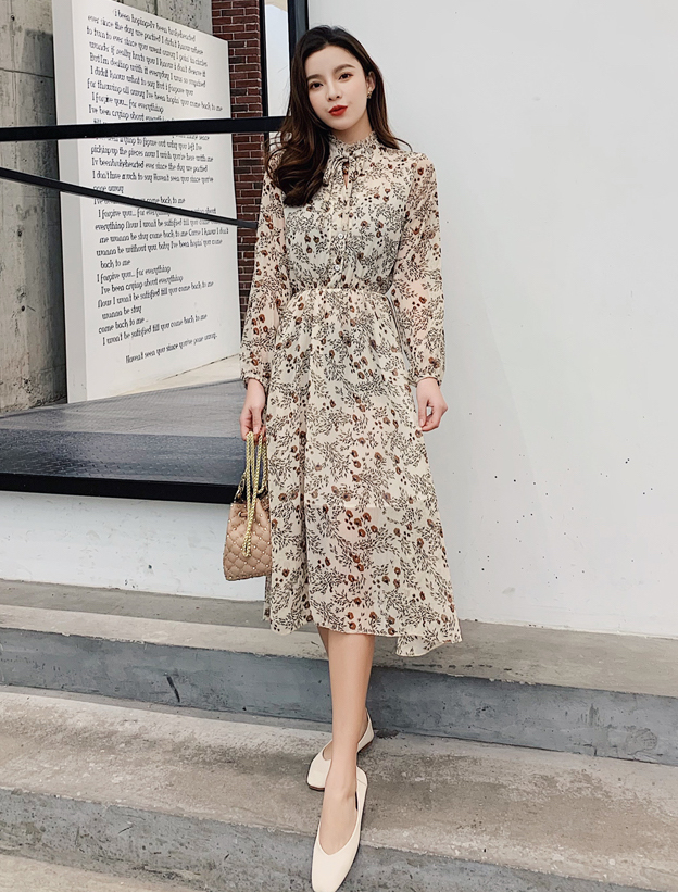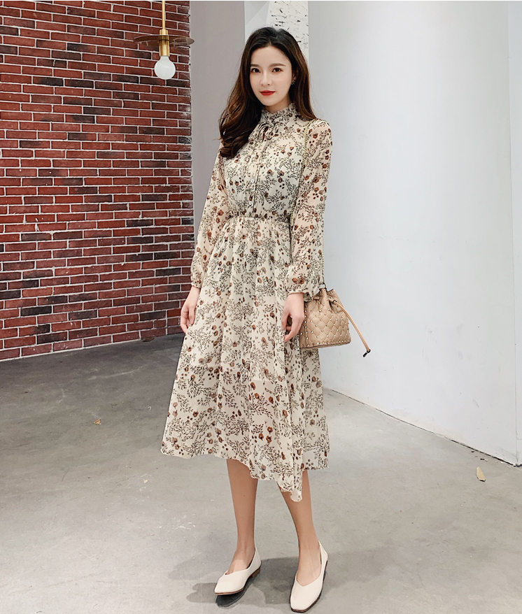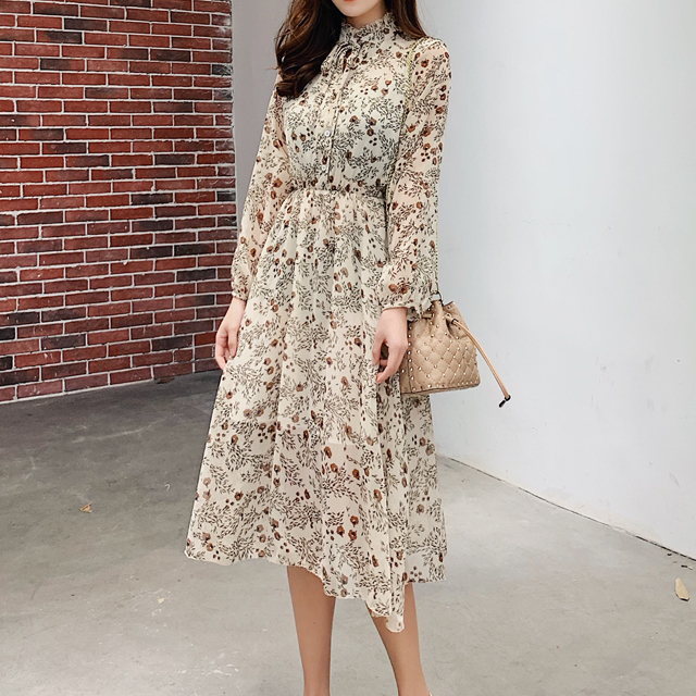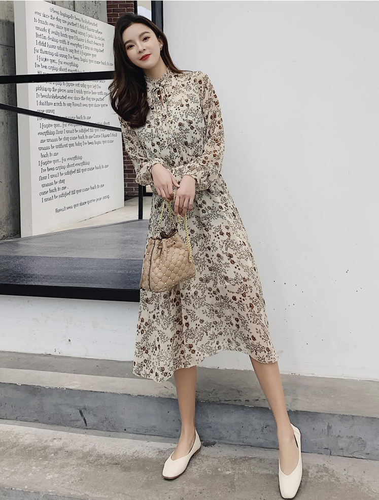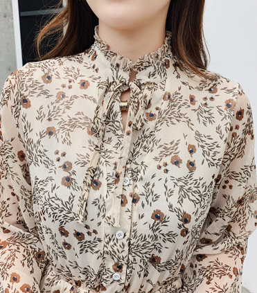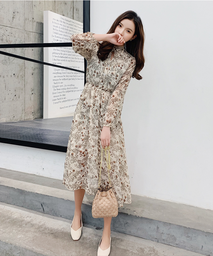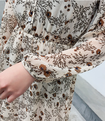 落ち着いたカラーと透け感が大人っぽく、女性らしい雰囲気の膝丈花柄ワンピースです。