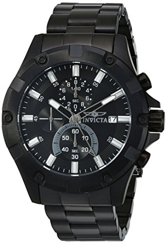 The man in need of a timepiece that will go from work to play with ease should check out this handsome Pro Diver from the unbeatable Invicta. The comfortable bracelet and mid-sized case, both bold in black ion plated steel with a practical water resistance of 100 meters, are paired with a sleek black dial with a 3 subdial chronograph for a functional piece that will be sure to meet the modern man's needs, no matter the occasion. This website is an authorized reseller of Invicta and each piece comes with the manufacturer warranty.Feature
