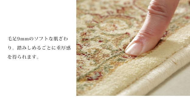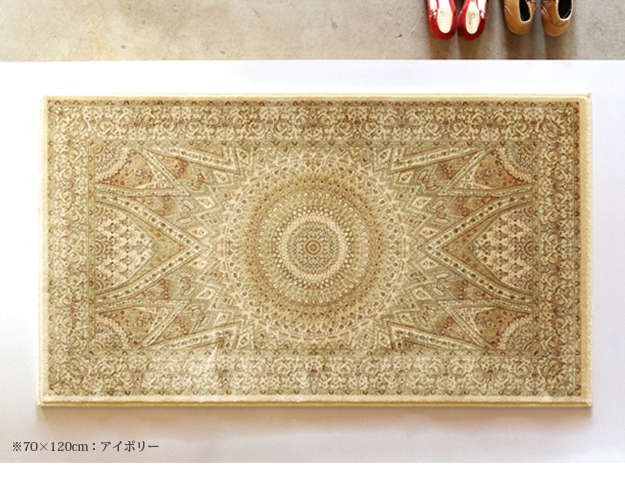 ※メーカー直送のため代金引換はお受けできません。※沖縄・一部離島は別途送料がかかります。お見積もりいたしますのでお問い合わせ下さい。商品について:レーヨンの細く柔らかい繊維を100万ノットの高密度で織り上げたベルギー製の玄関マット。繊細なデザインや光沢感、ソフトな肌触りが快適です。伝統的なベルシャデザインのゴンバット文様は、玄関をゴージャスな雰囲気に演出してくれます。サイズ(cm):幅70x奥行120cm・約3.5kgカラー:アイボリー・レッド材質:レーヨン100%株式会社ナカムラ(51000065)