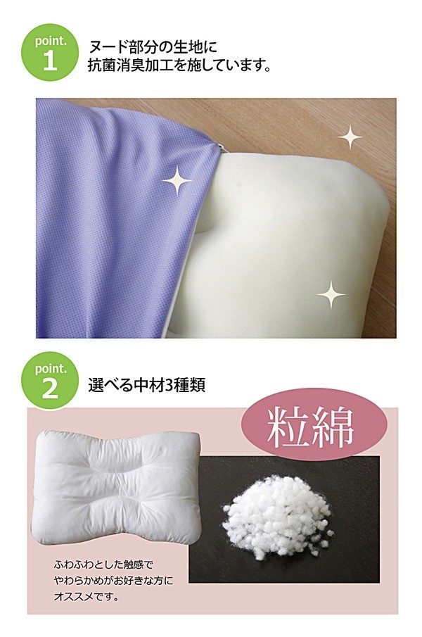 枕の嫌なにおいが気になる方におすすめの枕です。無地部分に抗菌・消臭加工をしております。効果としては、1.黄色ブドウ菌に対し菌の増殖を抑えます。2.においの原因となるアンモニア・酢酸・イソ吉草酸を消臭します。粒綿枕は、ふわふわと柔らかく、クッション性があります。また裏地はメッシュ素材ですので通気性が良いです。カバー部分は丸洗い(洗濯ネット使用)が可能ですのでいつでも清潔にご使用できます。