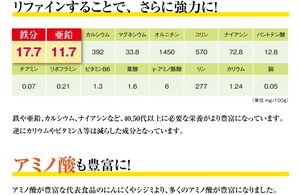 韮種粉末(中国産)、レバーエキス(豚、日本産)、ゼラチン(豚由来)、デキストリン、澱粉分解物、高麗人参末(中国産)、ステアリン酸Ca、微粒酸化ケイ素、着色料(カラメル)