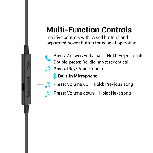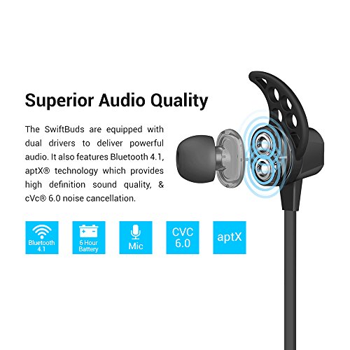 -. Feature : HD SOUND QUALITY - Featuring Bluetooth 4.1, aptX codec, and CVC 6.0 noise cancellation. Enjoy incredible HD sound quality with powerful bass and clear treble. / SECURE FIT - With our secure fit ear hooks, your wireless ear buds will stay locked in during physical activities. Great for working out, sports, and running. / SWEAT PROOF - With a rating of IPX4 sweat proof, there is no need to worry about sweat or rain. They are lightweight and comfortable during long-term use. / INTUITIVE CONTROLS - Control your music without touching your phone. Controls Skip/Pause/Play, volume, answer calls and use voice commands. / LONG BATTERY LIFE - Get a weeks worth of workouts on a single charge. Listen to music or talk on the phone for up to 6 hours. Fully recharge them in under 60 minutes.