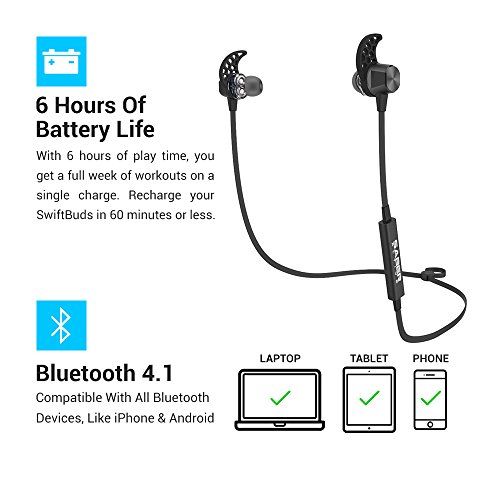 -. Title : Bluetooth In Ear Headphones V4.1, Wireless Earbuds with Microphone, Sweat Proof Sports Headset, Stereo Running Earphones with 6 Hour Battery, SwiftBuds by SaberActive - Black