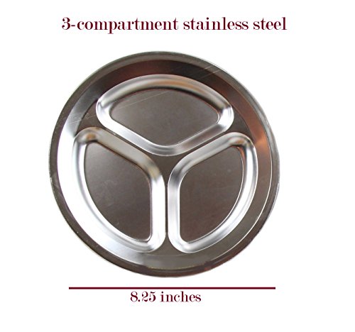 4 high quality 8.25 inch stainless steel dinner Plates with 3 divided compartments, the perfect material for outdoor tableware,