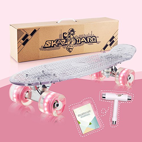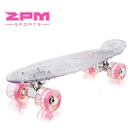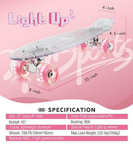 -. Feature : Pre-Assembled Complete - Make your daily commuting easier with this ready-to-ride mini cruiser. It can fits in your backpack and can be taken anywhere you go with ease by bus, subway or train. / Fresh Style Light up Skateboard - By day or night, this mini cruiser is sure to get you in style where you want to go, whether you are skating to the beach, riding your way around school in-between classes or just cruising around town. / Perfect Birthday Present and Holiday Gifts - Skateboard are loved by children of all ages and fun for adults, too. Leave the video games and phone inside. Enjoy hours of outdoor fun, Let's go outside and play! / Specification - 22" long x 6" wide crystal-clear polypropylene/PP deck with a 45°kicktail, lightweight aluminum trucks with 90A bushing, ABEC-7 high speed precision bearings, Smooth 59mm*45mm 78A polyurethane/PU LED light up wheels. Max Load Weight 220 lbs(100kg). / Buy now with confidence - 2pm Sports is dedicated to you customer and product experience, all skateboard comes in brand original package with a $10 value T-tool. If you're not 100% satisfied for any reason, simply return for a FULL REFUND with no questions asked. Click the Add to Cart button now. You'll be happy you did!