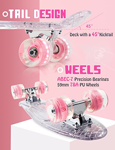 -. Title : 2pm Sports Paco Complete 22 inch Mini Cruiser Skateboards - Clear Small Banana Board with Glow Light up Wheels for Kids Boys Girls - Pink Wheels
