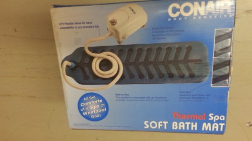 -. Binding : Misc. -. Brand : Conair -. Color : White -. EAN : 0074108191199 -. Feature : Soft mat cushions your body and produces thousands of therapeutic bubbles / Powerful full=body massage action adjusts from low to high bubbling action to relieve muscle aches and strains / All the comforts of a spa or whirlpool bath -. Model : 01NP247 -. PackageQuantity : 1 -. ProductGroup : Beauty -. ProductTypeName : BEAUTY -. Size : LARGE -. Title : Conair Thermal Spa Soft Bath Mat -. UPC : 074108191199