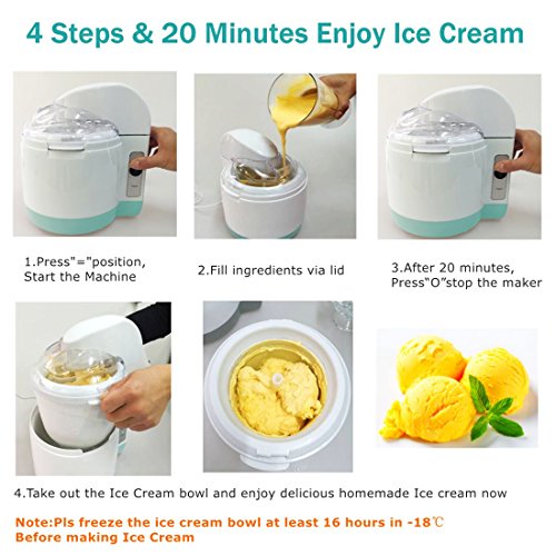 Just pre-freeze the bowl add ingredients.Press button and fully automatic.One touch button can enjoy delicious ice cream in 20 minutes