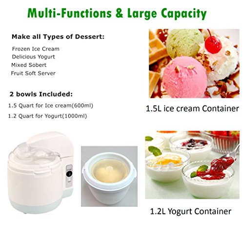 1.5 Quart Ice cream bowl and 1.2 Quart Yogurt bowl included.no need to buy extra bowl.Easy to clean and save space