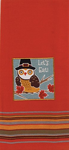 - Cotton tea towel features a pilgrim owl applique with embroidery detailing