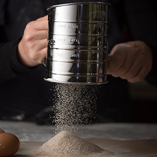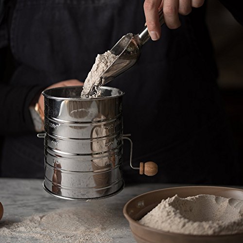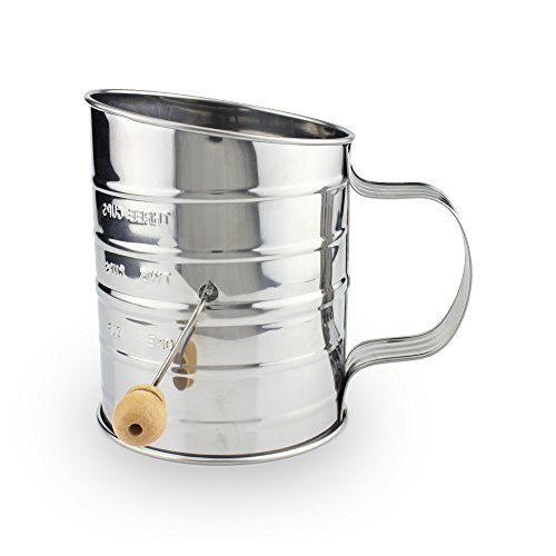 Part of running a successful bakery depends on having the best equipment to do a certain job. Our Premium Quality Stainless Steel Hand Crank 3-cups Flour Sifter w/ Wooden Handle aerates flour evenly and thoroughly. It has two wires to sift the flour. Each wire smoothly sweeps the screen below it, creating the smoothest flour possible and a consistent measure every time. Get yours today! The photos above will show you how amazing this item is. Product features: - Material: Stainless Steel - Product dimensions: 4.5" x 5.7" - Dishwasher safe.
