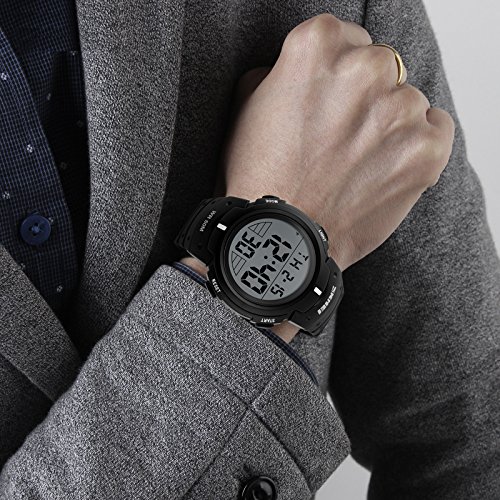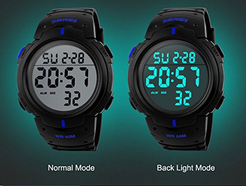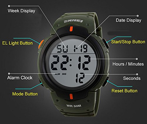 -. Feature : Simple design big LCD sreen display / Time, date, week, alarm clock, stopwatch, LED backlight / Fashionable sporty dial design, military style outlook / Black rubber strap, comfortable to wear / 5 ATM water resistance, convenience in your daily & sporty life