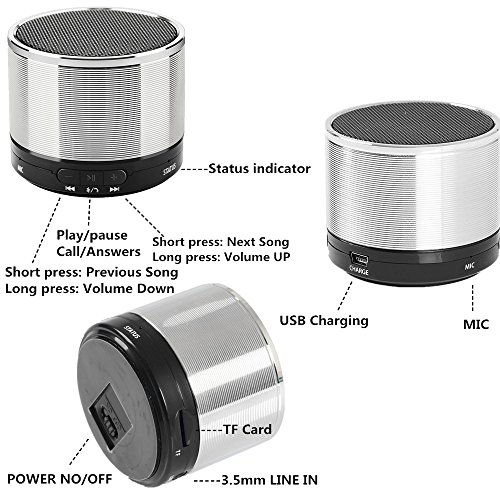 Features: the power switch is on the bottom of the speaker box, and the bottom is equipped with anti-slip mat to prevent the noise caused by low frequency vibration.The built-in high sensitivity microphone, the wireless free phone call is clear, TF socket, audio line socket, suitable for all devices with 3.5 mm audio output (computer, MP3, MP4 and PSP).