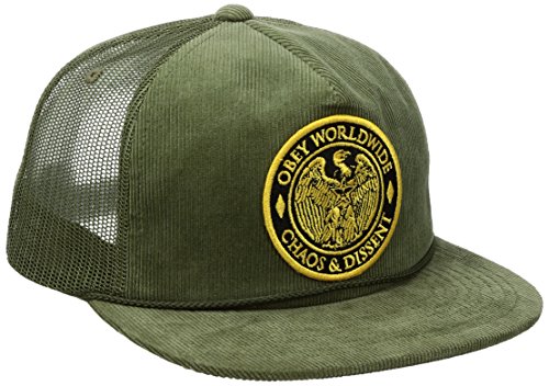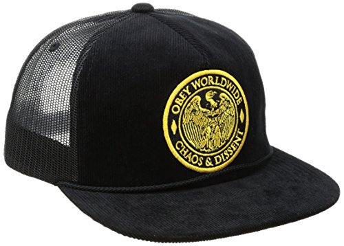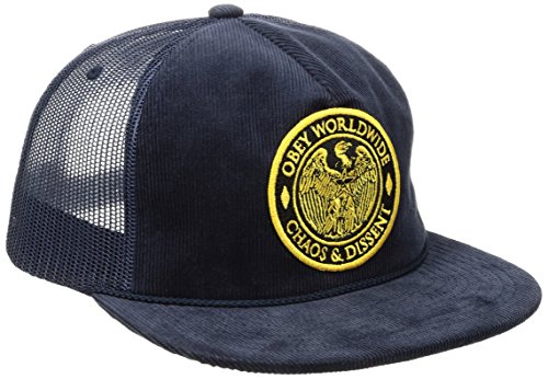 Product Description OBEY chaos trucker standard trucker fit. Cotton corduroy trucker hat with embroidered patch, plastic snap closure and woven flag label 0