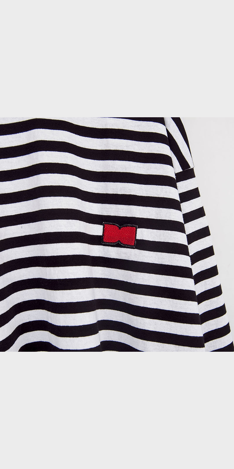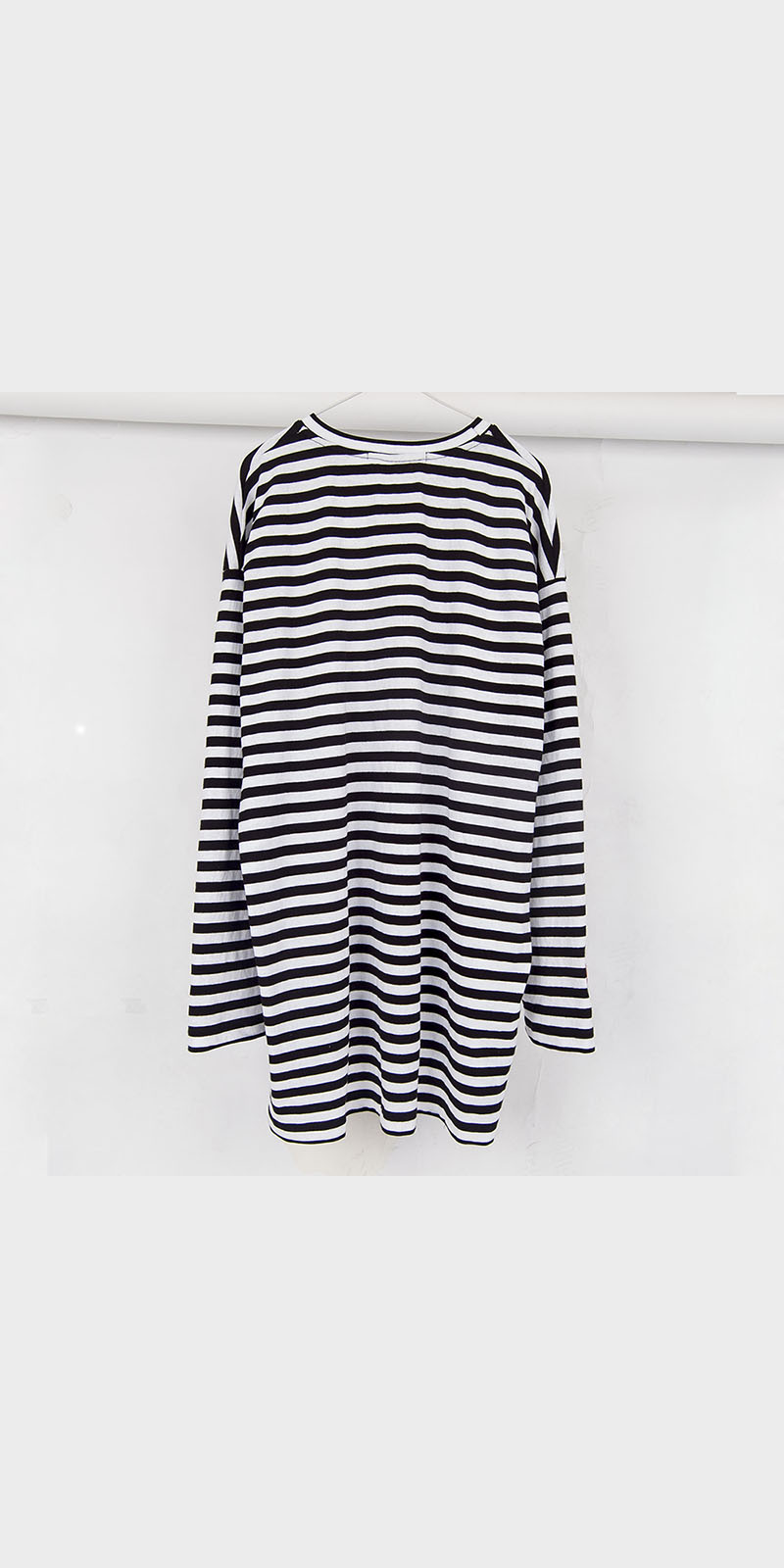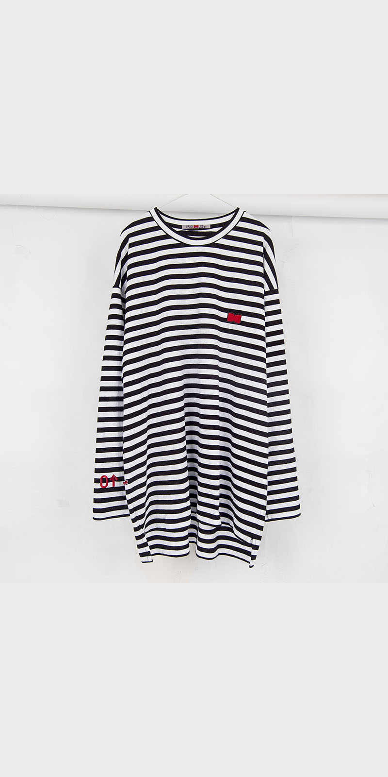 엉덩이를 훌쩍 넘는 긴 기장의 티셔츠 입니다. 면 100% 스트라이프 패턴소재를 사용하였으며 이번시즌 메인컨셉인 CO-ME 의 레이아이웃 디자인 자수가 들어가도록 디자인 하였습니다. 소매부분에는 디자인 넘버링 디자인으로 자수처리 하였습니다.이번시즌 기획되어있는 맨투맨 등에 레이어드 될 수 있는 기장으로 의도하였습니다.