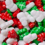 - Hard-shelled candy shapes of white snowmen, red & green trees are 1/2" long and 1/4" thick
