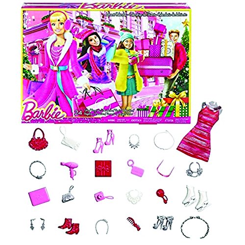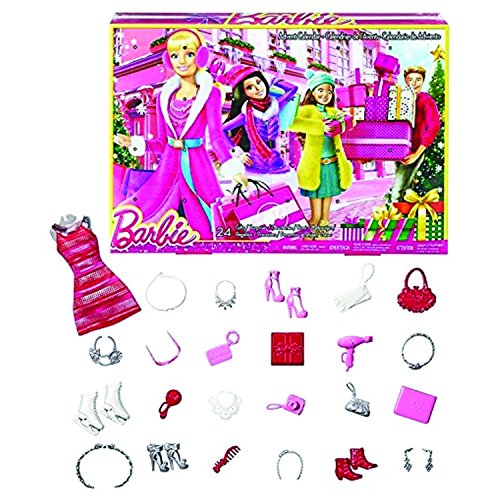 Celebrate the holidays in signature style with this Barbie advent calendar! Depicting a festive background with a modern look and sparkling print, girls will love opening a compartment each day -- for 24 days -- to discover a fab fashion, cool accessories and even a gift for the girl! With fashion items like shoes, purses and jewelry, as well as go-to pieces like a wrapped present, camera and hair dryer, girls will love playing out Barbie doll's busy holiday schedule when anything is possible. And in the 24th compartment, they'll find an accessory they can wear to look festive too! The calendar includes 24 items. Doll sold separately. Colors and decorations may vary.Feature