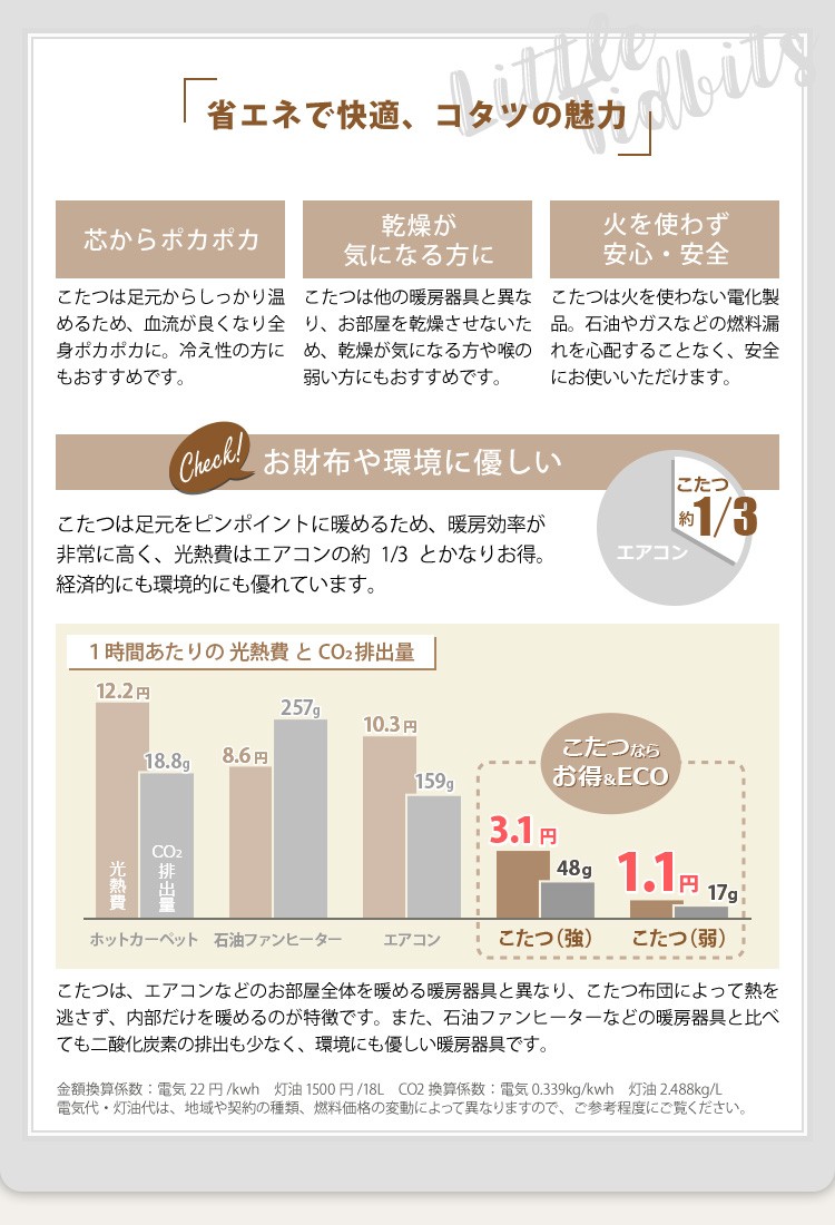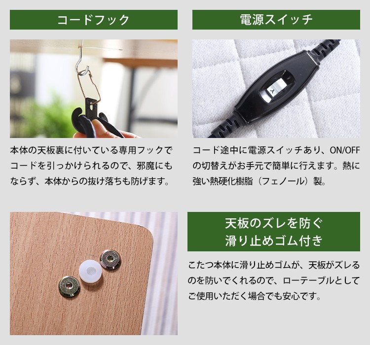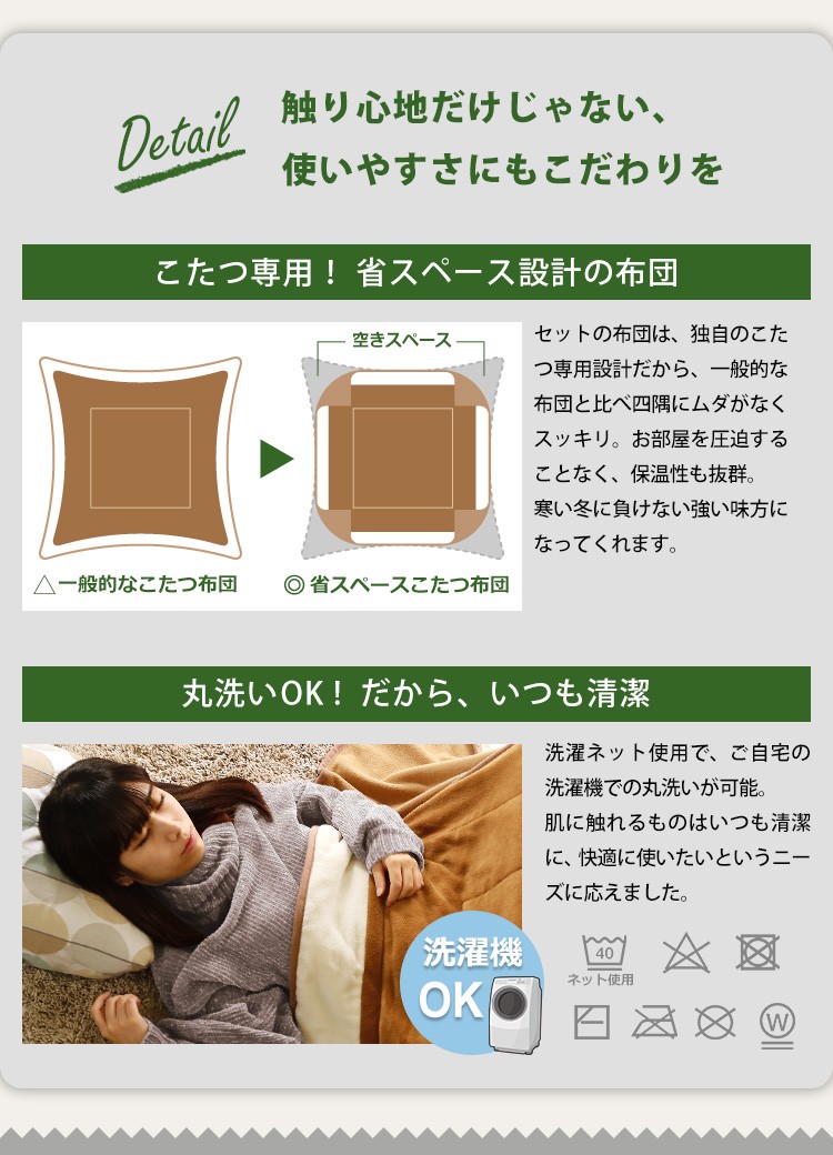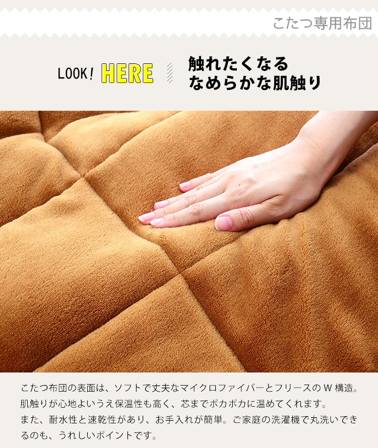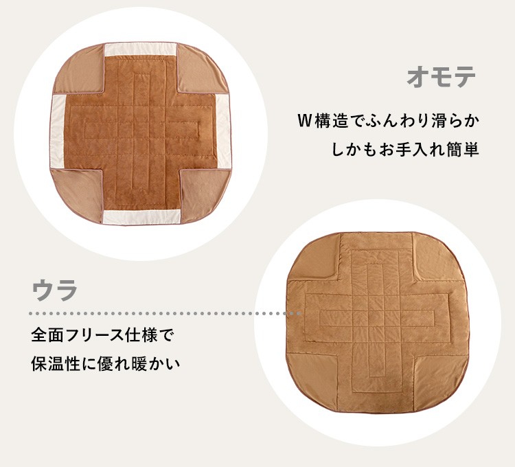 【こたつ布団】側生地:表地、裏地・コーナー部:ポリエステル100% 詰め綿:ポリエステル100%(重量118g)