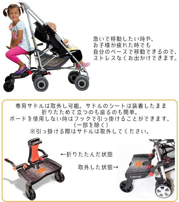 | 親子でお出かけするのは大変なものですが バギーボードがあれば赤ちゃんはベビーカーに 上の子はボードの上にと 一度に移動できます 素早く歩かないといけない時にも大助かりお子様が座れるサドル付なので座ってラクラク移動 使用しない時は折りたたんだり 取り外したりできます 優れたサスペンション機能が付いた大型2輪タイヤを使用することで スムーズで安定した走行を実現 工具不要で取付も簡単 |