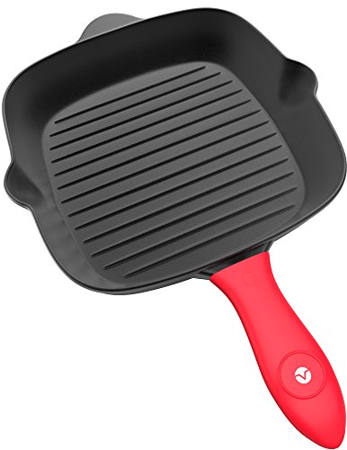 -. Feature : GRILL ALL YEAR - Enjoy healthy delicious grilled veggies and meat all year round with this premium cast iron grill pan / NATURALLY NON STICK - Pre seasoning creates nonstick surface without added fats or synthetic coating, and pan gets better and more flavorful the more you use it / EVEN HEAT FOR PERFECT TEMP - Pre heat grill pan on medium high before use for evenly distributed heat and perfectly cooked foods / GREAT FOR GAS COOKTOPS - Also works well on electric or ceramic stovetops or in oven - can even be used directly over campfire or open flame outdoors / INCLUDES PROTECTIVE HANDLE COVER - 11 inch square grill pan should be hand washed and dried thoroughly to preserve quality and seasoning