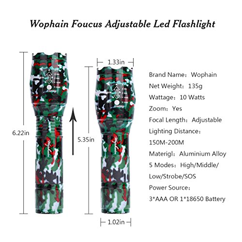 LED Tactical Flashlight,Wophain Super Bright 800 Lumens CREE XML T6 LED Outdoor Handheld Flashlight Adjustable Focus Zoom Flashlight With 5 light Modes, Ultra Bright, Zoomable,Water Resistant-C
