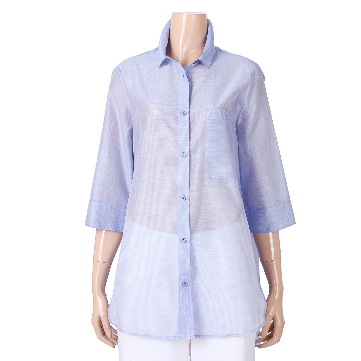 이 제품은 가볍고 편안하며 시원한 제품으로 정장 케쥬얼에 부담없이 입을 수 있는 셔츠형블라우스 입니다