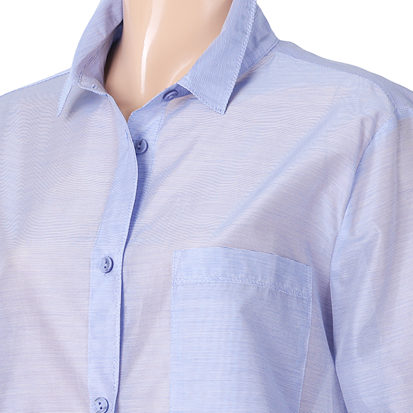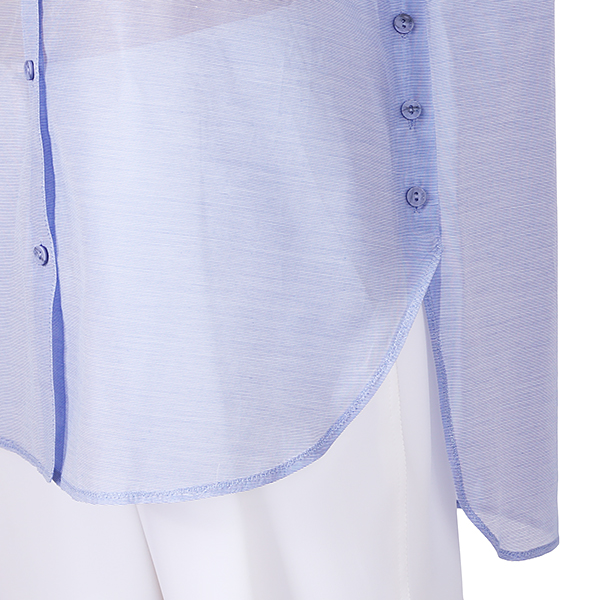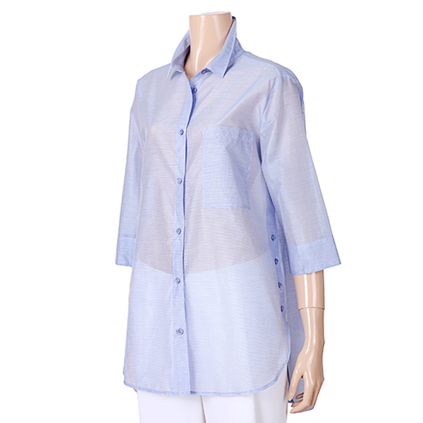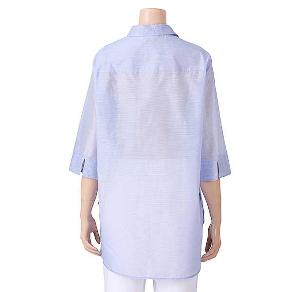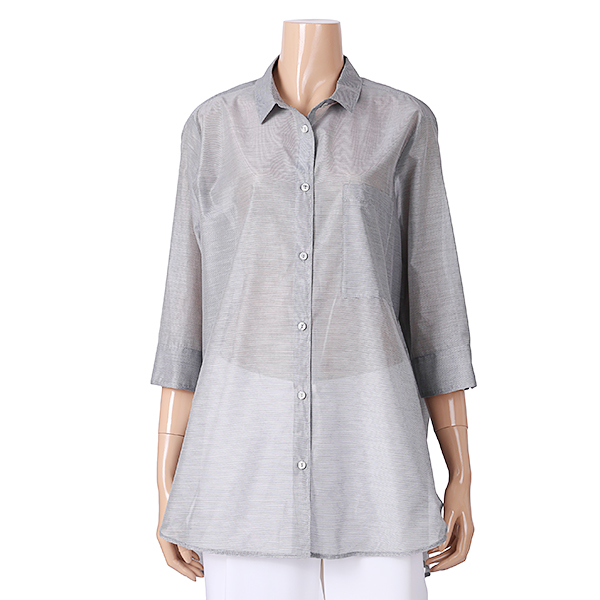이 제품은 자연스러운A라인의 가볍고 시원한 홉겹의 셔츠형 블라우스 입니다