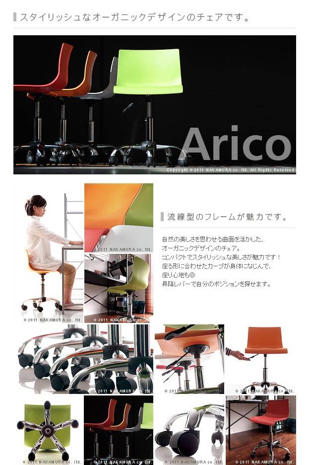 商品について:自然の美しさを思わせる曲面を活かしたオーガニックデザインのチェア。座る形に合わせたカーブが身体になじんですわり心地も◎昇降レバーで自分のポジションを探せます。キャスター付きで移動もラクラク♪お部屋のアクセントにもなる軽快なカラー☆