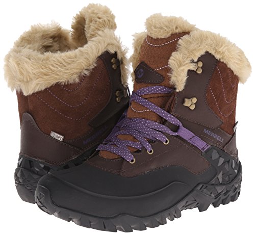 FEATURES of the Merrell Women's Fluorecein Shell 8 Waterproof Boot PU coated Waterproof leather and Fabric upper Traditional lace closure Bellows tongue keeps debris out 400g lightweight, low bulk insulation keeps you warm Faux fur collar EVA removable footbed Compatible with snowshoes Molded nylon arch shank Merrell air cushion in the heel absorbs shock and adds stability Waterproof seam sealed constructionFeature