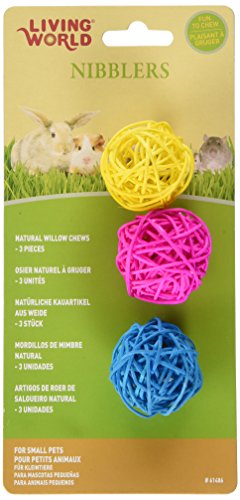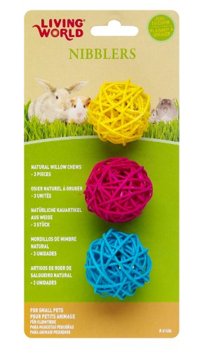Studio : Living World Publisher : Living World Binding : Misc. Product Description Living world nibblers willow chew balls contain 3 colorful ball-shaped willow chew balls. Living world nibblers are specially designed chew toys that help improve your small pet's dental health. They are also fun to chew on and are an excellent boredom buster. Available in a variety of shapes, sizes, and colors, nibblers are made of a range of all-natural materials such as wood, loofah, willow, corn husk and raffia. All nibblers are color-finished using non-toxic food colorants. Some nibblers come with a chrome-plated steel rod attachment that can be either hung or fastened to the cage. 0