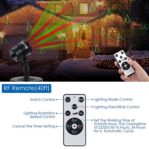 ★ENERGY SAVING - Laser Christmas lights turn on/off automatically depend on the setting, so you can set this laser lights on at dusk and off at dawn. Set a timing mode using the remote control and the light will turn on the same time every day or night and turn off again either 2, 4, 6, or 8 hours later, this make it costs 99% less energy than regular string lights