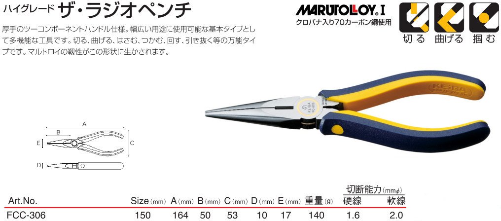 ● Length (mm): 164 ● Tip shape (mm) E × F: 3.3 × 2.3 ● Fall preventing string attaching hole: None ● Cutting capacity (mm) Hard wire: φ1.6 ● Cutting capacity (mm) Soft wire: φ2