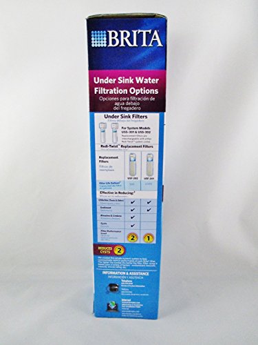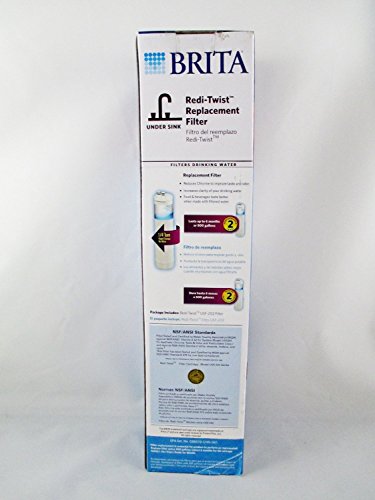 Brita Redi-Twist Under-Sink Replacement Filter, Level 2. Reduces select VOC's, cysts, chlorine, silt, rust and sediment. Highest performing quick twist carbon block filter available. Auto water shutoff, Lasts up to 6 months. Dimensions: 2.5"L X 2.5"W x 10.5"H