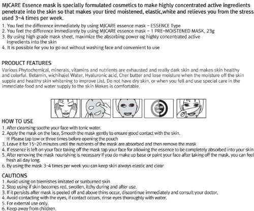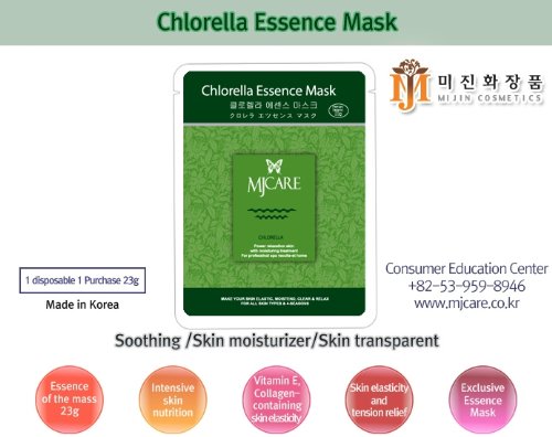 - Feature : MJCARE NEW Essence Facial Mask Pack - Chlorella Essence 10 Pcs / MJ CARE essence mask is specially formulated cosmetics to penetrate active ingredients into the skin / It will make your skin look younger, moisterized, elastic, bright and relieve you from stress. / Power relaxation skin with Moisturing treatment. / For ALL SKIN TYPES AND FOUR SEASON.