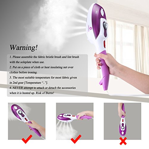 Warning! For safety! ♥ Please assemble the fabric bristle brush and lint brush with the soleplate when use. ♥ Put on a piece of cloth or heat insulating net over clothes before ironing. ♥ The most suitable temperature for most fabric given in 2nd gear [Temperature ".."]. ♥ NEVER attempt to attach or detach the accessories when it is heated up. Risk of Burns!