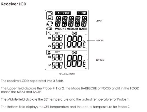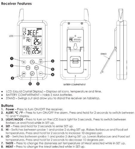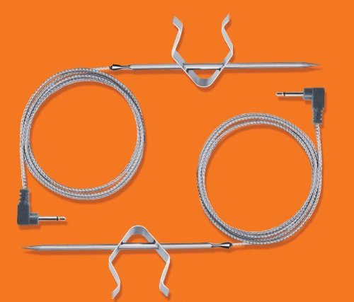 - Feature : New Features include: Larger Backlit Screen Shows more information (you can now see the Temperature from both probes simultaneously) , 2 Hybrid Probes are included, Easier controls and 15 New Preset Temperatures of types of meat to choose from / Monitor internal temperature of meat from 300 feet away; wireless receiver with LCD beeps and flashes when meat temperature goes above your programmed temperature / Includes a Count up and Down timer for timed cooking / Probe wires are 3 ft long and are rated for 716°F; Operated on 4 AAA Batteries Included / Preprogrammed Temperatures include 15 types of meat and poultry; All Preprogrammed Temperatures can be reprogrammed to set cooking temperatures to suit your personal taste