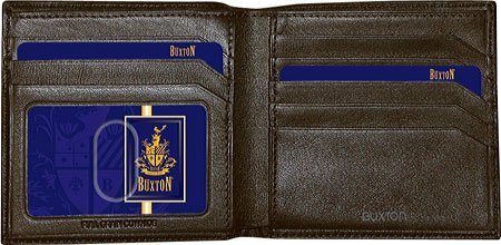-. Feature : Wallet opens to reveal two full-length currency pockets with stash pocket for spare house and car keys / 2 additional utility pockets / 7 angled credit card pockets / Angled thumb slide ID window / Plastic photo holder can display ten pictures