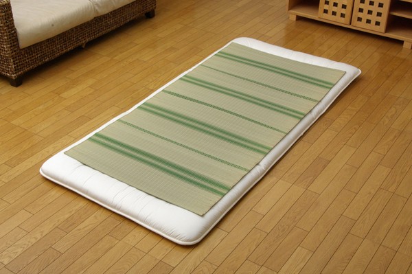 国産(熊本県八代産)のい草を使用したネゴザ(寝ござ)です。国産のイ草は一本一本が太く、表皮が厚く繊維がキメ細かいので、弾力性があり、耐久性に優れています。い草には1.綿の3倍の吸湿性があり汗のじめじめを軽減します。2.湿度の調整作用があり、蒸れにくく快適な就寝を促します。3.汗のにおいの元となる化学物質を90%以上抑え、においを軽減します。などの効果があります。い草に青森ヒバ加工を施しています。(抗菌・防臭効果)
