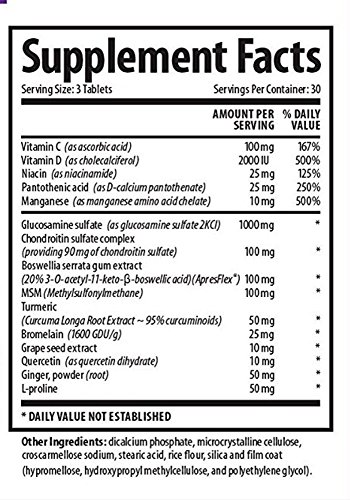 -. Feature : We know it's a pain when you don't feel free to move like you used to. Our expertly formulated blend of glucosamine MSM chondroitin & clinically proven ApresFlex helps you stay active. It supports healthy joint function increases your comfort during routine movement and strenuous activities. / ApresFlex is an advanced ingredient clinically proven to support healthy joint function in a verified double blind controlled study (1). Glucosamine supports cartilage production, by providing the building blocks of cartilage, while MSM contains natural sulfur. These two help support healthy & strong connective tissues. Chondroitin is a naturally-occurring compound within the tissues of cartilage. Its purpose is to draw water in to support elasticity & other shock-absorbing properties / Other High-Quality Ingredients & nutrients in the formula include vitamin C and D3 grape seed extract l-proline ginger root bromelain turmeric curcumin (95% curcuminoids) curcuma longa root extract and boswellia serrata gum extract. / Manufactured in the USA at our cGMP certified facility enforced by the FDA . NOT manufactured with sugar dairy wheat gluten soy preservatives artificial colors or flavors We simply use the highest quality raw ingredients. No handful of horse pills like other brands, just 3 easy-to-swallow tablets / Mental Relief Ultra Money Back Guarantee - Use the entire bottle If you aren't 100% satisfied then we don't want your money. Zero Risk - It's as simple as that