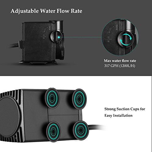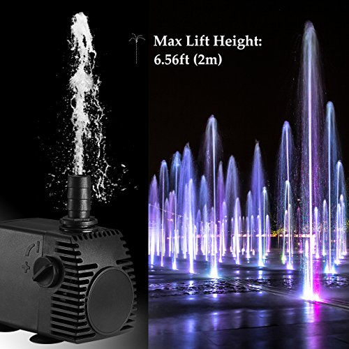 - High Lift and Strong Suction Cups. Strong power can elevate column of water up to 6.56ft, making the fountain landscape more attractive. At the same time, the high lift is convenient to filter the slot settings. The pump can be strongly adsorbed on the surface of fish tank and tile. It’s easy to install with the four suckers, either vertically or horizontally.