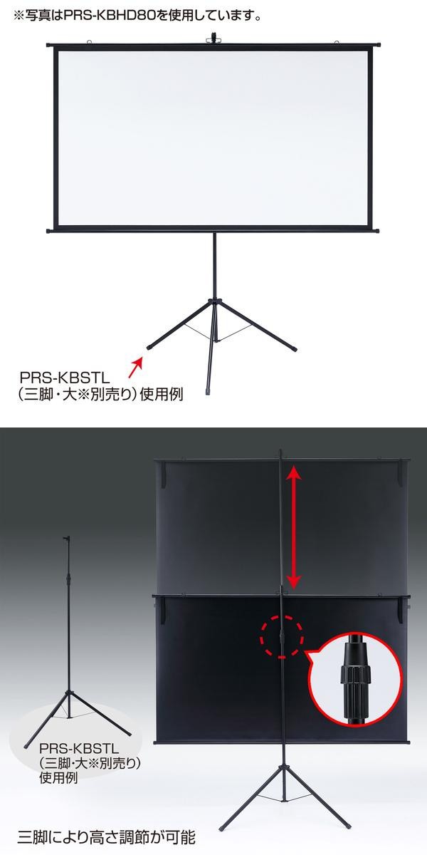 シンプルな壁掛け仕様のプロジェクタースクリーンです。使用しないときは、スクリーンを巻いて収納できます。別売りの三脚を使って、簡易三脚式として使えます。