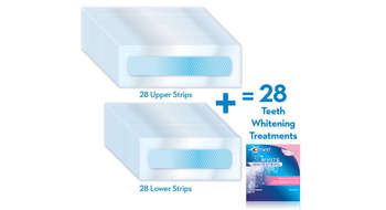 Important usage information: Keep out of reach of young children. Product is not intended for use in children under the age of 12. Do not swallow plastic strip. Crest 3D White Whitestrips is not a substitute for regular dental care. Visit your dentist regularly. Avoid contact of gel with eyes, cloth, leather, or fabric. Gel that comes into contact with the skin can cause temporary skin irritation and/or whitening. Tooth Sensitivity & Gum Discomfort: With all whitening products you may experience tooth sensitivity and/or gum discomfort. These effects are generally mild. These effects are temporary and not harmful. If you are in need of dental work, have dental work, or have staining from medication, ask your dentist if whitening is appropriate. Crest 3D White Whitestrips will only whiten natural teeth. The strips will not whiten caps, crowns, veneers, fillings or dentures. Store in cool place. See insert for more information. Questions: 1-800-395-8423 or visit www.3Dwhite.com Package includes 56 strips: 28 treatments (each with 1 upper/1 lower)