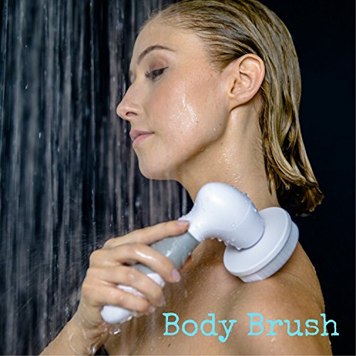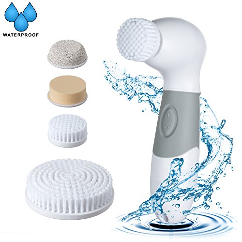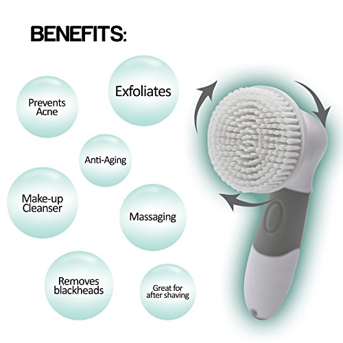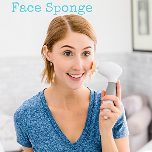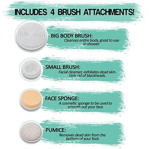 - 4-in-1 SPIN BRUSH SET FOR FACE AND BODY: The facial brush cleansing system is equipped with 4 brush heads – a facial scrub brush, a facial sponge, a body cleansing brush, and a Pumice Stone. The brush simultaneously cleanses and exfoliates, with deep pore cleaning, removing six times more dirt than conventional cleansing while restoring the skin elasticity. You don’t need to worry any longer about aging skin, as the cleansing brush rotates, it sloughs of dead skin cells and promotes of new skin.