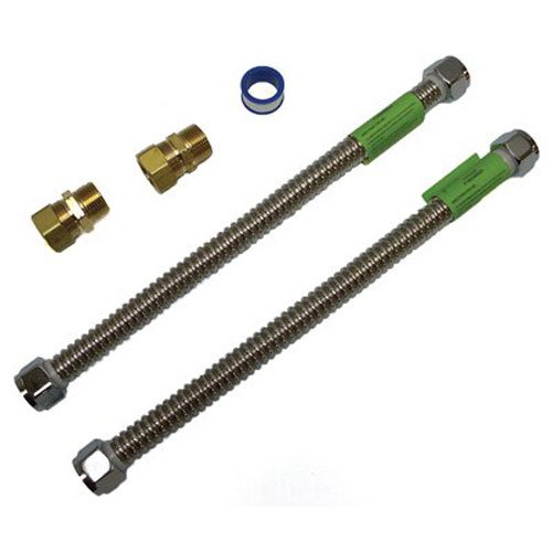 - Includes: two 15" flexible water connectors, two 3/4" long pipe nipples, two 3/4" pipe connectors, two 1/2" pipe connectors, two 3/4" X 1/2" reducer bushings, one 5' roll of Teflon tape, one wire clamp and two wire nuts